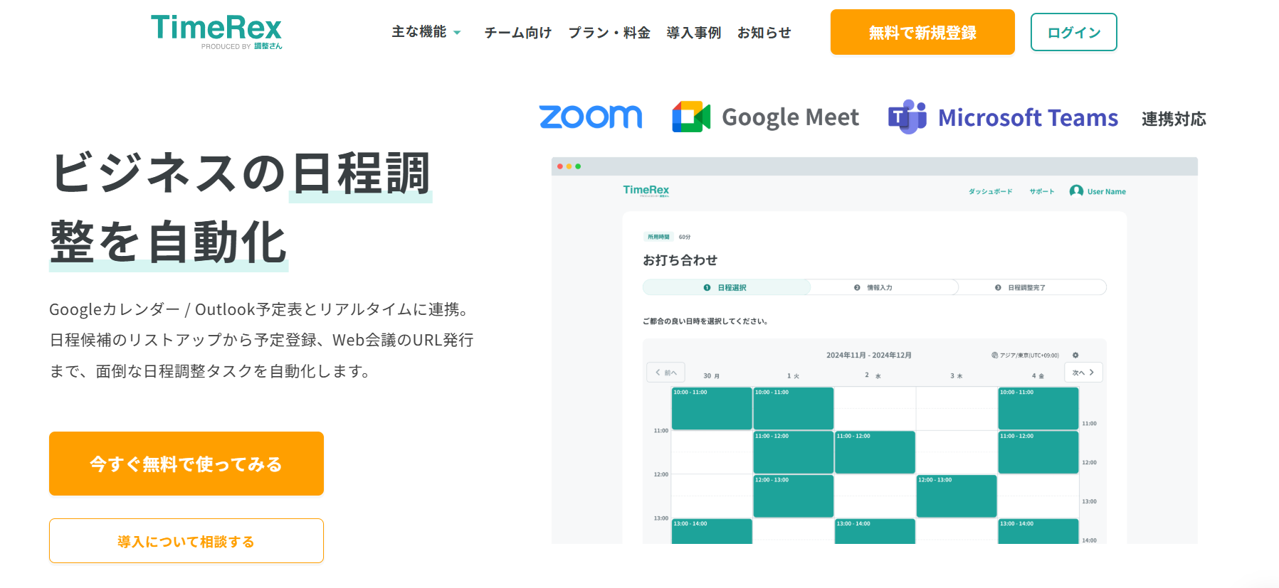 TimeRexは、日程調整に特化したクラウド型予約ツールです。営業面談やオンラインミーティング予約を効率化することを目的に設計されています。GoogleカレンダーやOutlookと連携し、空き時間を自動抽出して予約受付を行います。法人利用や営業チームでの活用を想定した位置づけです。