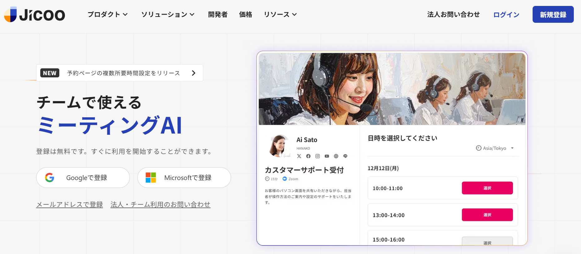 日程調整リンク作成、カレンダー自動連携、予約通知、Zoom連携、チーム管理機能などを搭載しています。空き時間の自動表示により調整メールの往復を削減できます。複数担当者の同時日程調整にも対応可能です。