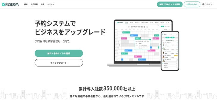 RESERVAは、35万社以上が導入している予約システムです。350業種の多種多様な企業や事業者に適している予約システムであることに加え、マニュアルが豊富なためPCの使用が不慣れな人でもかんたんに導入できます。