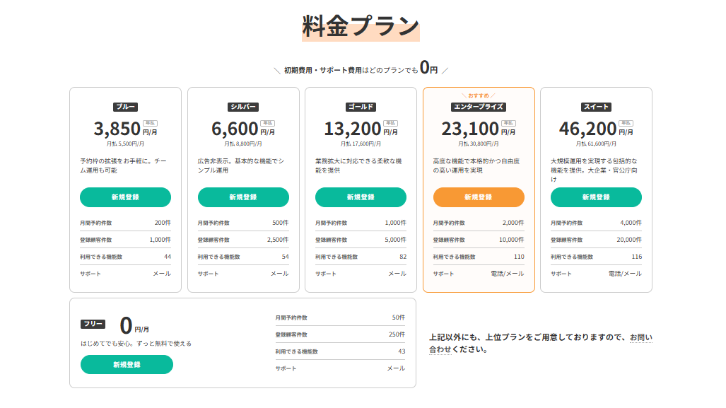 予約システムの導入を検討している方にとっては、サイトの設定や管理がかんたんであるかどうかは非常に重要な指標となります。そのため、操作性が高く登録項目の少ないRESERVAは、導入のハードルが低く、予約システムの利用開始を後押しします。さらに、RESERVAは無料のフリープランから手軽に始めることができ、事業規模の拡大にあわせてアップグレードできるのが強みです。