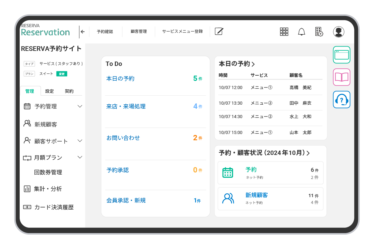 予約管理の際に必要な項目が、管理画面トップにあるTo Doリストに記載されているため、迷わず操作できることに加え、その日の予約や顧客の状況も一目でわかるような工夫がなされています。月額プランや顧客データの集計・分析、カード決済履歴などの項目も、それぞれ左カラムにまとめて表示されているため、かんたんに管理したい項目を切り替えられます。