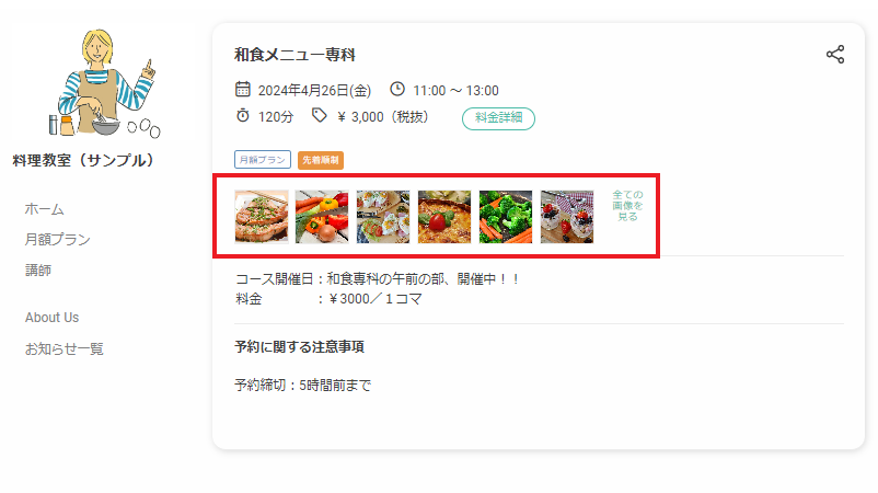さらに、メニューの説明画面では、ギャラリーとして最大20枚まで写真を掲載することが可能です。商品やサービスに関連した写真を登録することで、サイト訪問者はサービスの具体的なイメージを持つことができます。