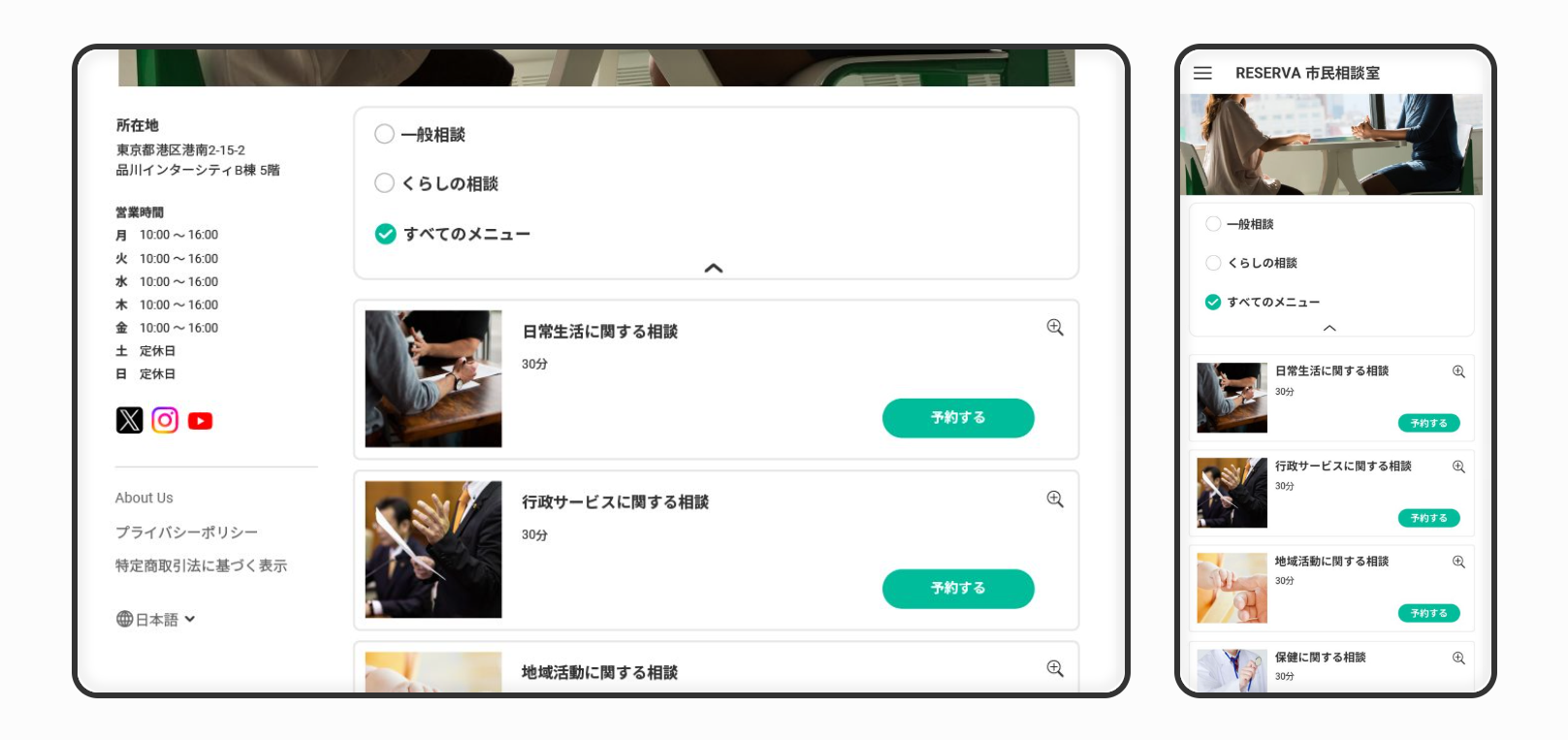 官公庁や医療機関、金融機関などのフォーマルなサイトから、サロンやスクールなどの個人事業主向けの親しみやすいサイトまで、幅広いデザインに柔軟に対応できるのがRESERVAの強みです。