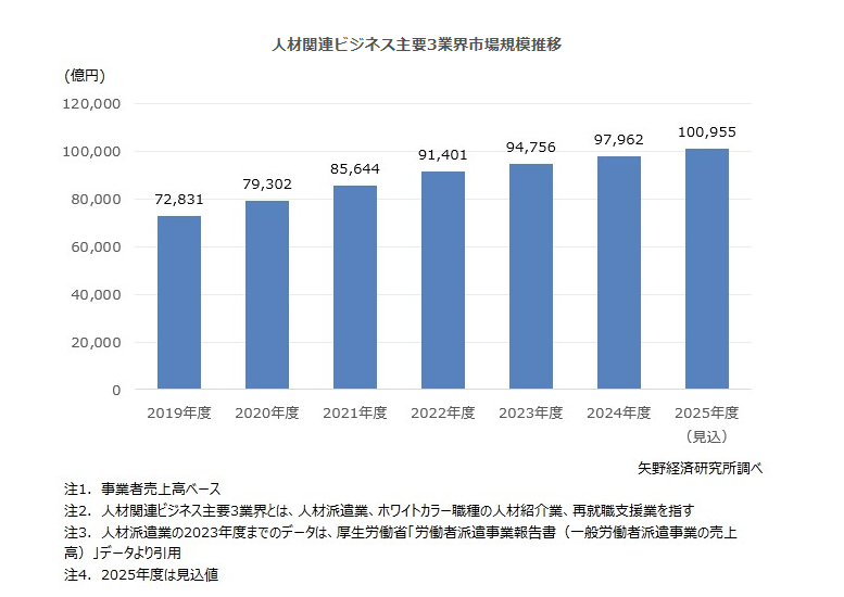 同所の調査結果によると「人材派遣業市場は、就労人口の減少や働き方改革を起因とする労働力不足を背景に、主力の一般事務派遣が好調を維持した。また、ITエンジニアや介護系人材は需要の高まりに対し人材の供給が逼迫する状況が続いている。人材紹介業市場は、ここ数年において二桁増の高い伸長率で推移していたが、当年度後半以降、景気の先行き不透明感が広がる中、企業の人材採用意欲の減退等を受け微増推移に留まった。」 とあり、IT業界などにおいては今後更なる人材ニーズが生まれることも視野に、人材ビジネスモデルの再構築、業界の選定、そして何よりも人材会社自身のDX化を真剣に考えるときが来ています。