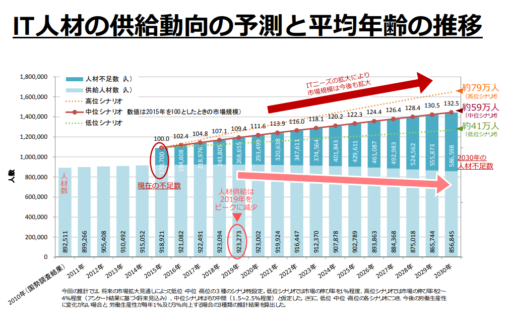 業務のDX化を果たすには、それを熟知しているIT人材の確保が必須です。経済産業省による報告書「第1回 『第4次産業革命スキル習得講座認定制度(仮称)』に関する検討会 参考資料3 (IT人材育成の状況等について)」では、2030年には少なくとも約41万人、最大で約79万人ものIT人材が不足すると予測されています。