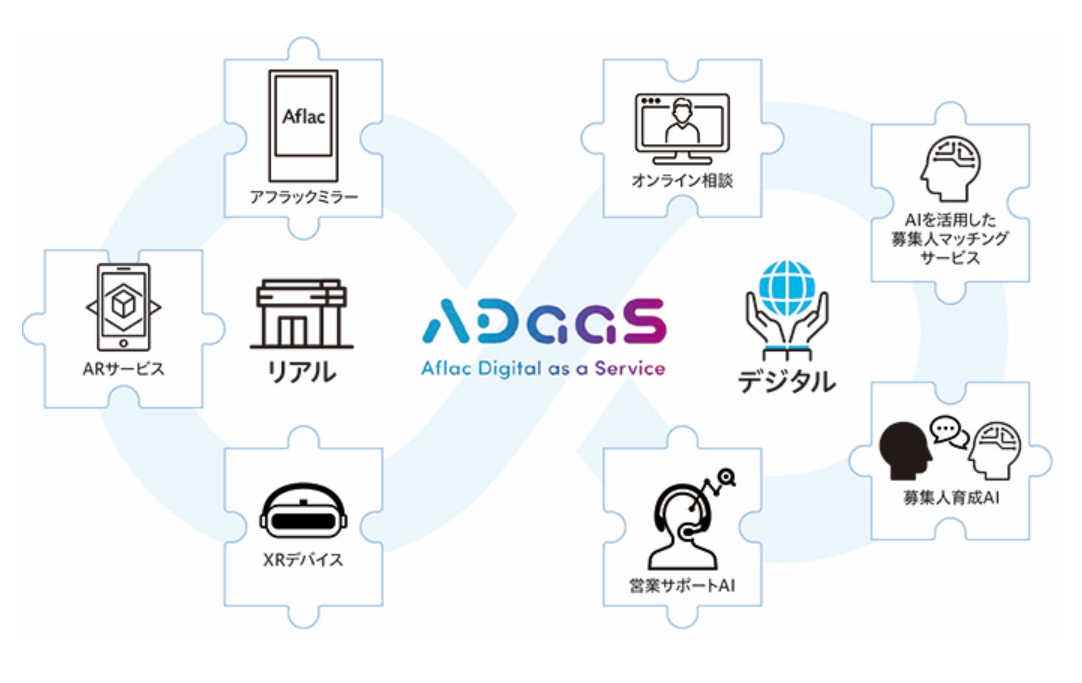 アフラック生命保険会社は、現実とデジタルが融合した環境の中で、感動的なユーザー体験の創出と社会的課題の解決ができることを目指しています。その一環として、2022年より独自のクラウド型デジタルサービス「ADaaS(アダース)/Aflac Digital as a Service」の運用を開始しました。デジタルを活用した営業活動やその他の業務をサポートし、顧客に新たな体験価値を提供しています。これにより、顧客サービスの向上、販売代理店のDX推進、ビジネスパートナーとの連携強化が可能になります。