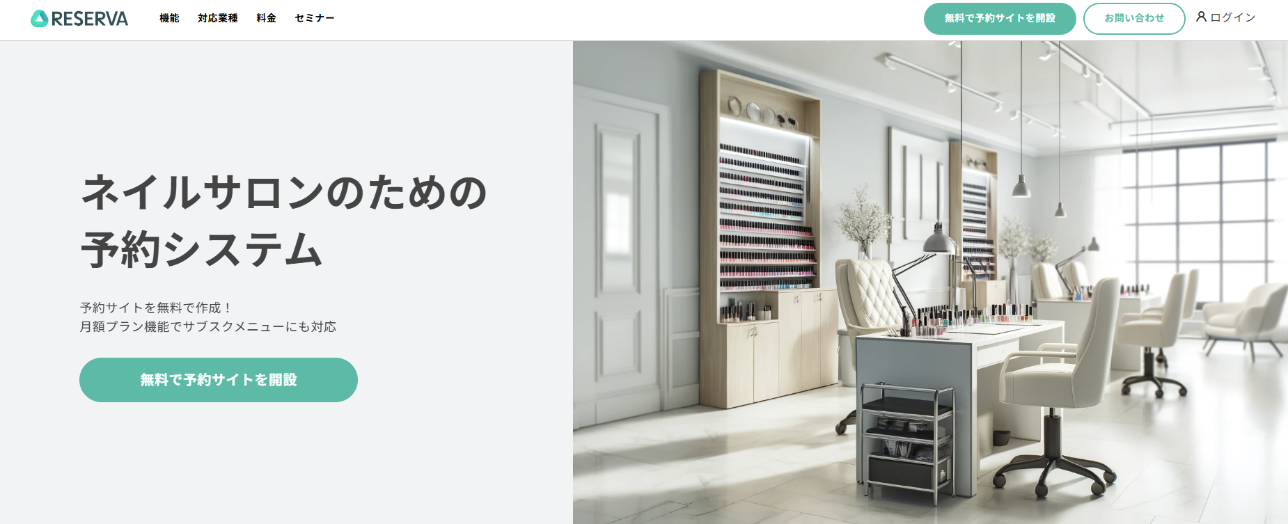 予約管理システム「RESERVA」は350以上の業種に対応し、登録事業者数が35万社を突破している、日本で最も選ばれている予約管理システムです。無料のフリープランが用意されており気軽に試せるほか、SaaS型サービスのため設定を3分ほど行ったらすぐに受付を開始できるのがポイントです。また、同システムにはオンラインカード決済機能が搭載されており、ネイルサロンのメニューの予約と合わせて、支払いを来店前に完了させることが可能です。