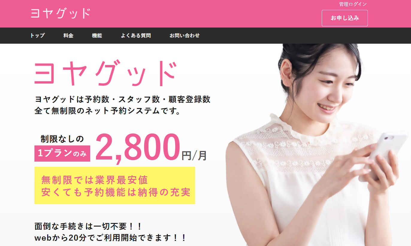 YOKICHIは、美容室やサロン以外の業種でも利用できる多業種対応の予約システムです。無料トライアルアカウントの申し込みも可能で、20日間利用できます。従量課金がない点も安心して使えるポイントです。