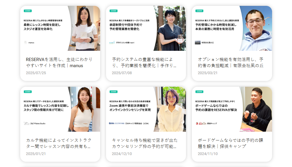 RESERVAマガジンでは、以下のように予約システムを導入した運営者の生の声が紹介されています。RESERVA予約システムはゴルフスクールの運営に役立つ機能を数多く搭載しており、実際にゴルフスクールのみならず、料理教室やヘッドスパスクールなど、多数の運営者に使用されています。