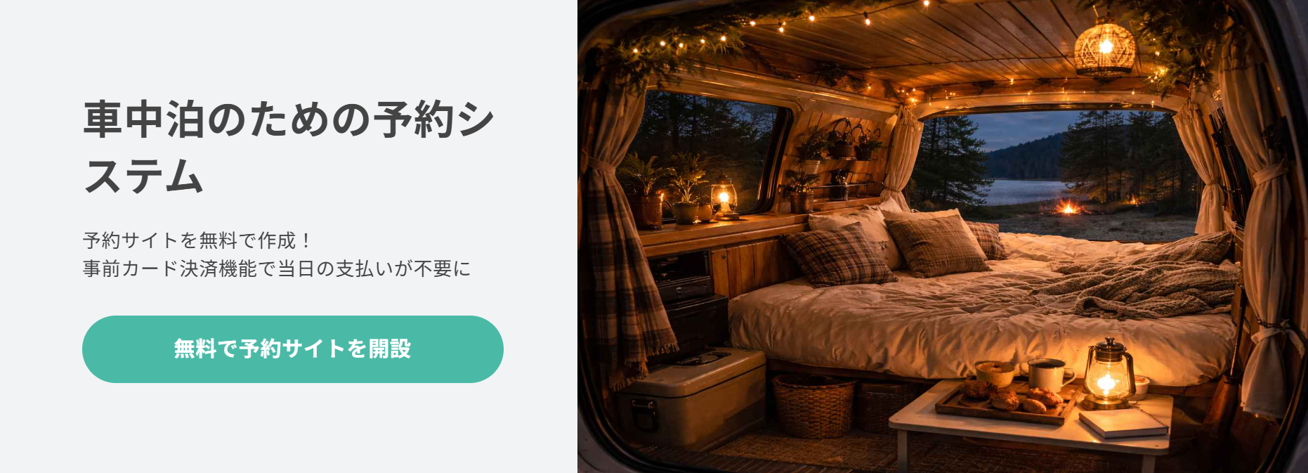RESERVAのような柔軟性の高い予約システムを活用することで、運営負担を軽減しながら、利用者にとっても安心で快適な車中泊環境を提供できます。今後の車中泊市場の発展において、予約システムは欠かせない存在となっていくでしょう。